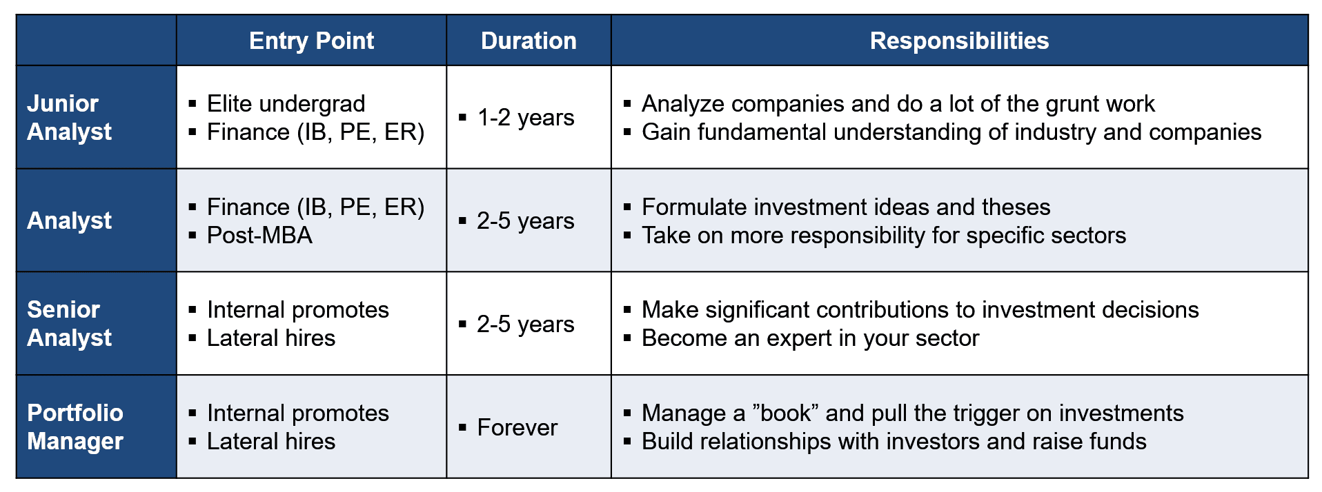 Analyst (2–5 years): Takes on deeper sector coverage and may begin pitching investment ideas. Individuals might enter post-MBA or from lateral industry moves.