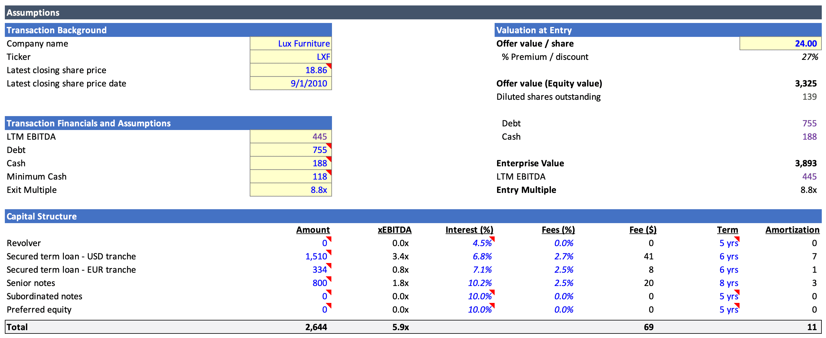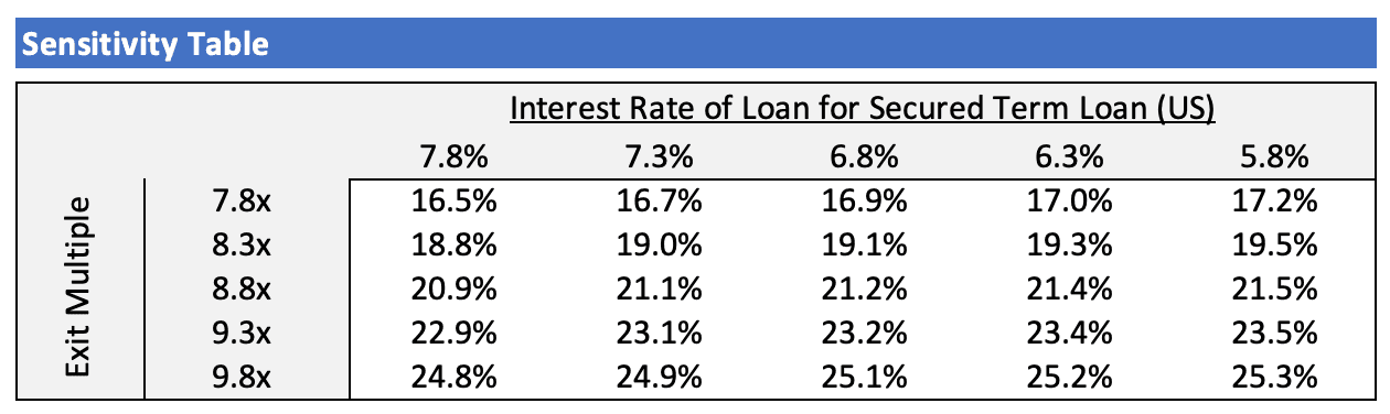 8 p.m. The next few hours are spent finalizing the first draft of the LBO, running trading comps, and doing a high-level DCF to validate your entry multiple. You also create sensitivity tables to see how key assumptions impact the IRR.